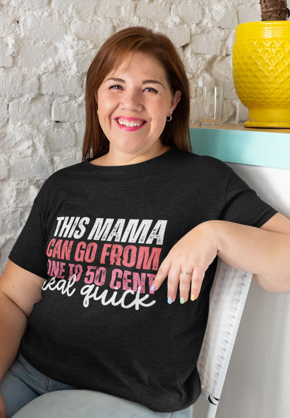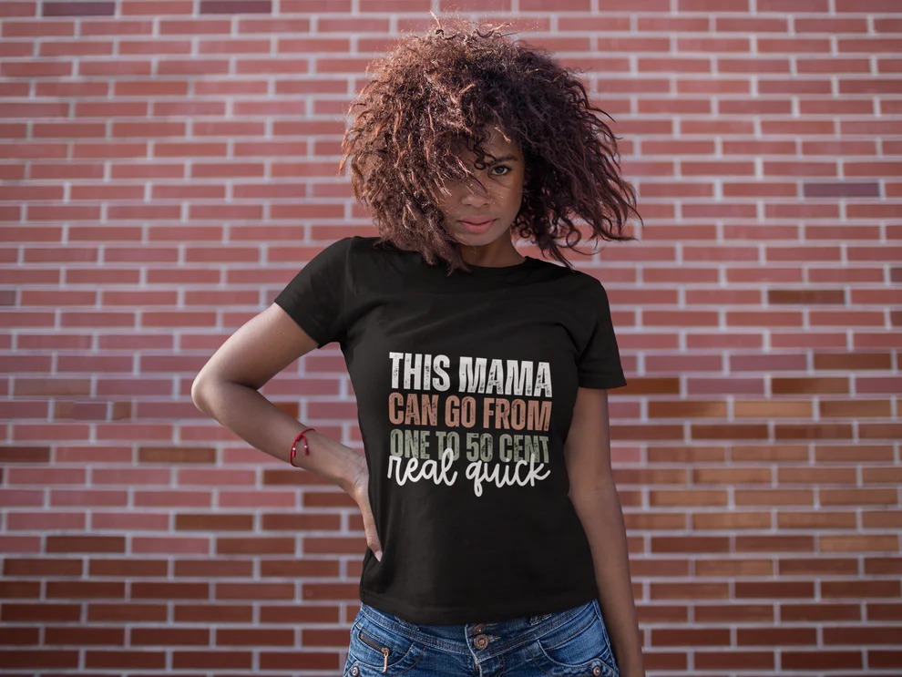 This playful graphic tee features the phrase “This Mama Can Go From One to 50 Cent,” a witty pop-culture nod that moms everywhere can relate to. It’s lighthearted, expressive, and full of personality without crossing ad-policy lines.