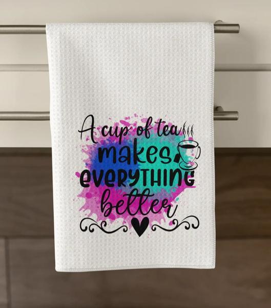 A warm mug, a quiet moment, and suddenly everything feels better. Our “A Cup of Tea Makes Everything Better” kitchen towel adds cozy comfort and cheerful color to your space — a sweet reminder that tea has a way of fixing just about anything.