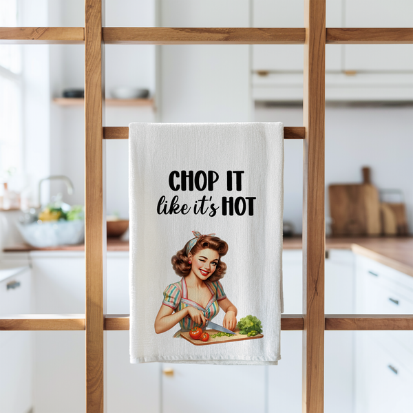 The “Chop It Like It’s Hot” tea towel features a playful retro cook winking while chopping fresh vegetables. With a fun nod to a classic song and vintage kitchen style, it adds personality and humor to everyday cooking.