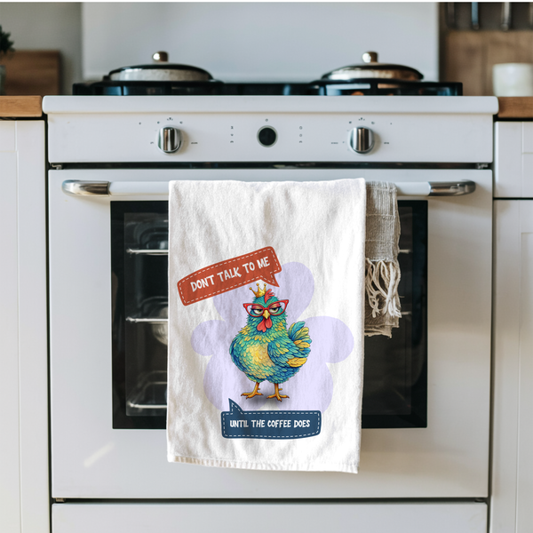 The “Don’t Talk to Me Until the Coffee Does” tea towel features a colorful chicken wearing glasses and a tiny crown, delivering a message many people understand before their first cup of coffee. Funny, relatable, and full of personality, it adds a little humor to your kitchen routine.