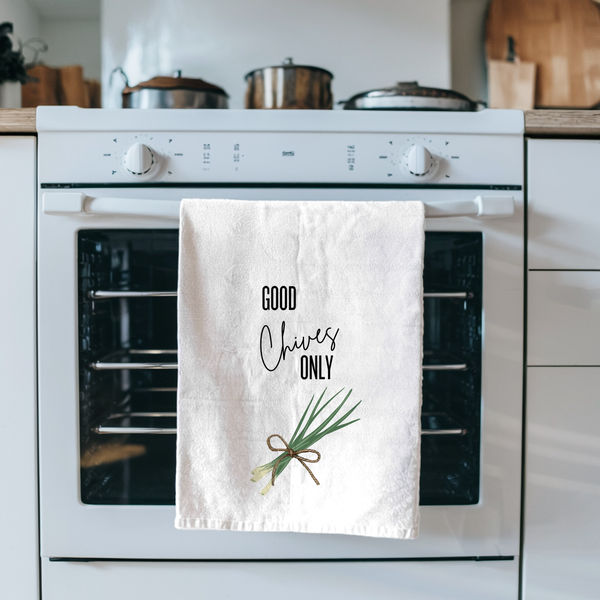 Bring nothing but good vibes (and good herbs!) into your kitchen with this playful tea towel. Featuring the witty phrase “Good Chives Only,” this towel adds a fun twist to your cooking space — the perfect blend of humor, charm, and function.