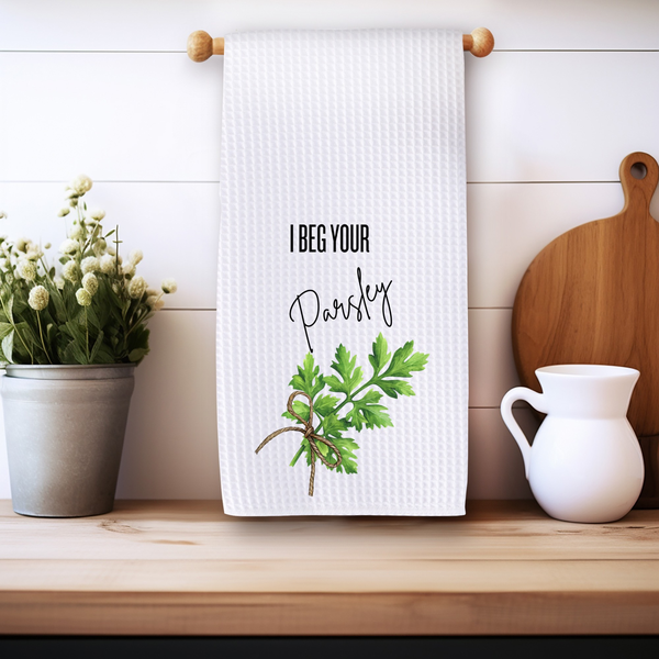 Bring a little sass (and a lot of charm) into your kitchen with this cheeky tea towel! Featuring the witty phrase “I Beg Your Parsley,” it’s the perfect blend of humor, practicality, and farmhouse style. Whether you’re wiping up spills, drying dishes, or just showing off your love for herb-inspired wordplay, this towel is sure to make guests smile.