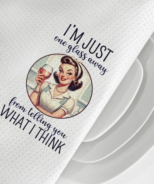 We’ve all been there. Our “I’m Just One Glass Away From Telling You What I Think” kitchen towel serves vintage sass with a splash of honesty, making it the perfect statement piece for kitchens with a sense of humor.