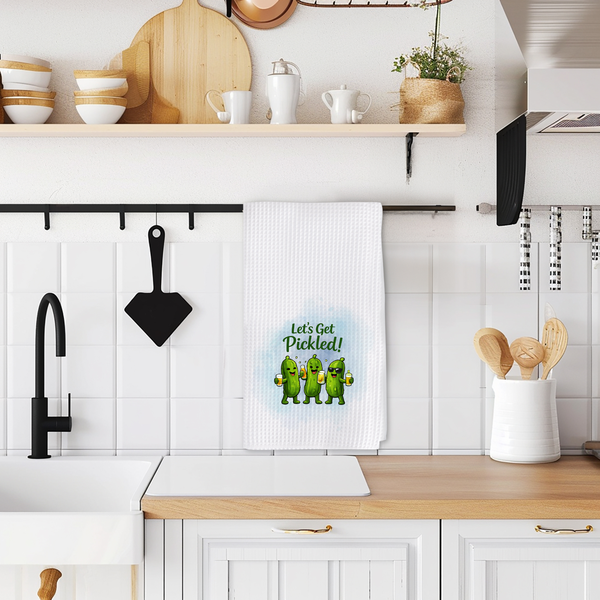 The “Let’s Get Pickled” tea towel brings the party to your kitchen with a trio of cheerful pickles raising a glass. It is playful, a little cheeky, and perfect for anyone who enjoys a good pun with their cooking.