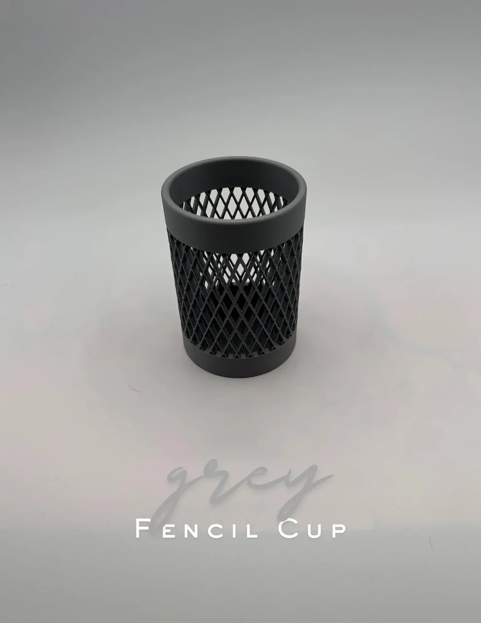 • Grey Pencil Cup – Ventilated, modern, and sturdy enough for pens, markers, scissors & more