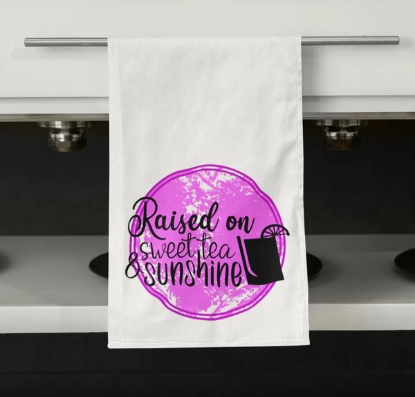 This “Raised on Sweet Tea & Sunshine” kitchen towel brings warm, feel-good vibes straight into your kitchen. With playful lettering, a bold pink watercolor-style circle, and a charming tea bag graphic, it’s the perfect mix of Southern charm, nostalgia, and everyday humor.