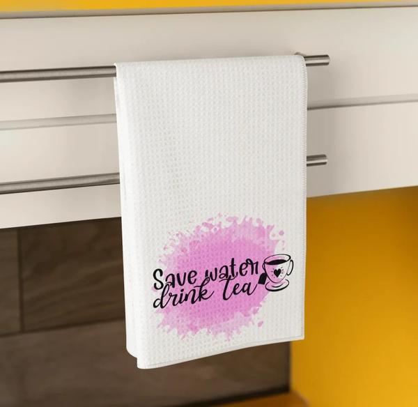 This “Save Water, Drink Tea” kitchen towel adds a playful, eco-humor twist to your kitchen or coffee bar. With bold lettering, a cheerful teacup graphic, and a soft pink watercolor-style splash, it’s the perfect mix of cozy charm and witty personality.