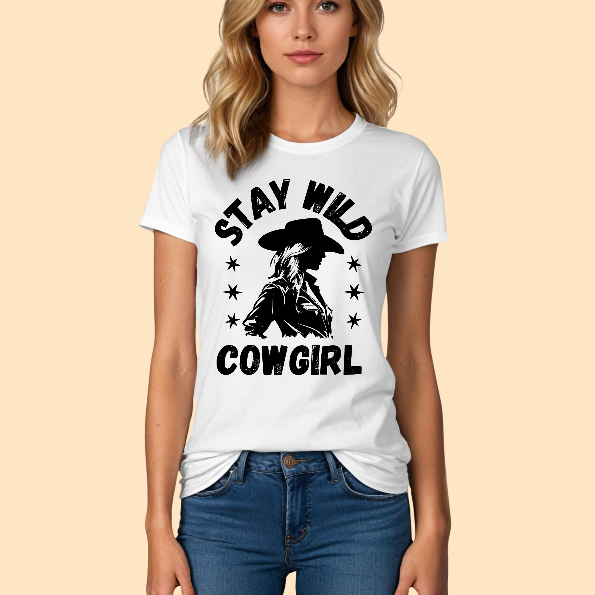 A bold western-inspired design with vintage cowgirl energy. The “Stay Wild Cowgirl” graphic captures that independent spirit with a classic western silhouette and distressed style.