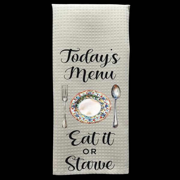 Our “Today’s Menu: Eat It or Starve” towel brings the ultimate kitchen truth to life — because sometimes, dinner is what it is. Featuring a colorful dinner plate and utensil design on a textured waffle-weave background, it’s the perfect mix of humor, honesty, and homey charm.